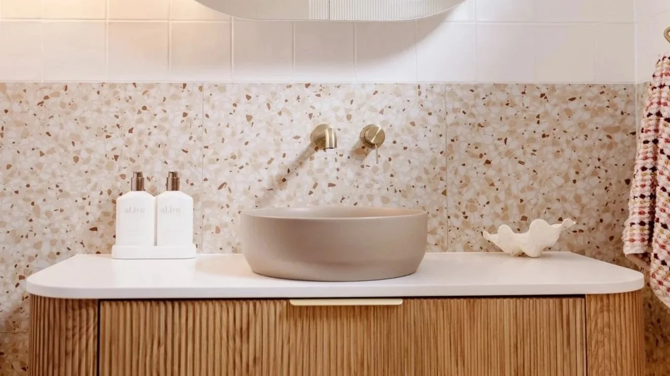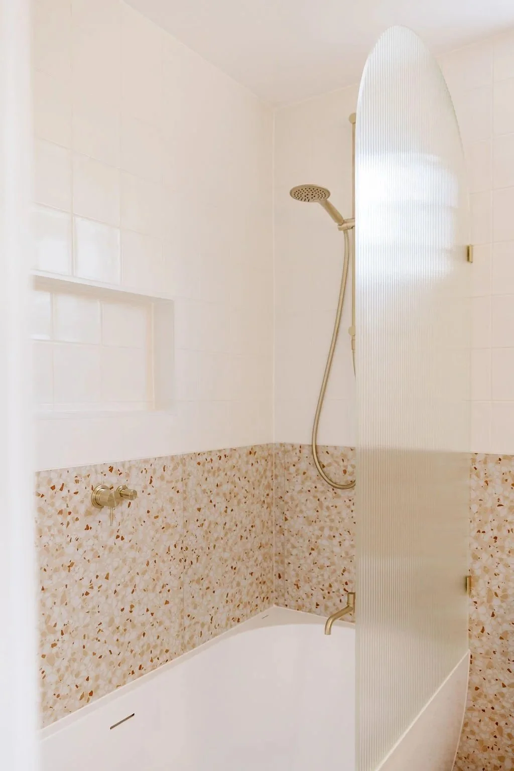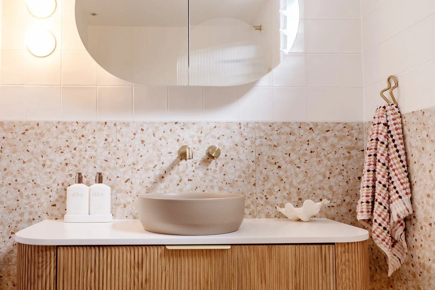 The finished space features terrazzo tiles, warm timber joinery and brushed brass fixtures, creating a soft, coastal palette that feels relaxed, contemporary and perfectly suited to its beachside setting.